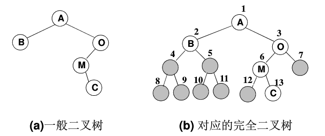 - 对于一般二叉树,也可以用这样的方式储存。不过首先需要把非完全二叉树用空节点变为完全二叉树: