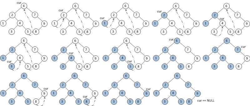 Morris Traversal方法遍历二叉树(非递归,不用栈,O(1)空间)