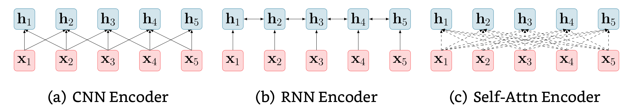 其中 xi\mathbf{x}_i 是 token xix_i 的嵌入向量,hi\mathbf{h}_ixix_i 的表征,Encoder\text{Encoder} 是一个神经网络编码器。