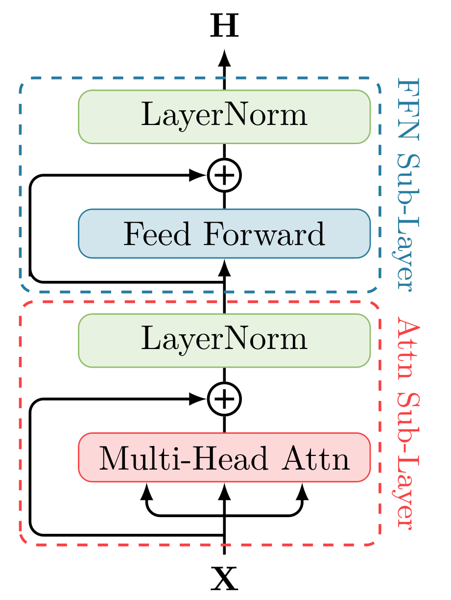 Hattn=LayerNorm(MultiHead(X)+X)Hffn=LayerNorm(FFN(Hattn)+Hattn)\begin{aligned} \mathbf{H}_\text{attn} &= \text{LayerNorm}(\text{MultiHead}(\mathbf{X}) + \mathbf{X})\\ \mathbf{H}_\text{ffn} &= \text{LayerNorm}(\text{FFN}(\mathbf{H}_\text{attn}) + \mathbf{H}_\text{attn}) \end{aligned}