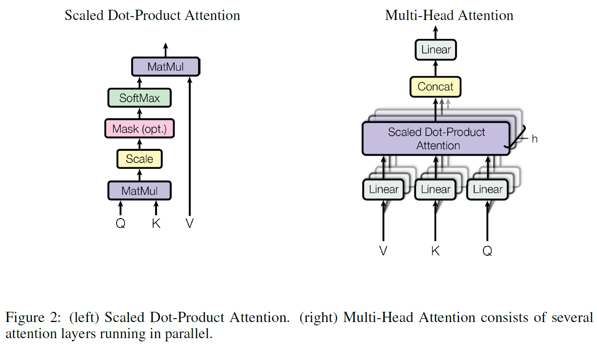 我们使用的Attention称为 Scaled Dot-Product Attention。它的输入包括维度为 的queries和keys,以及维度为 的values。我们计算每个 querry 与所有 keys 的点乘,并除以 ,然后经过一个 softmax 获取所有 values 的权重。