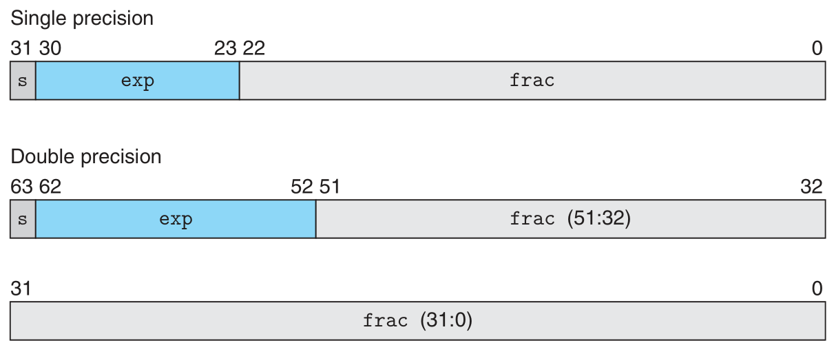 下图所示是这三个字段在字中的两种最常见格式,对于单精度浮点数,s,exp 和 frac字段分别为 1,8,23 位;对于双精度浮点数,s,exp 和 frac 字段分别为 1,11,52 位。