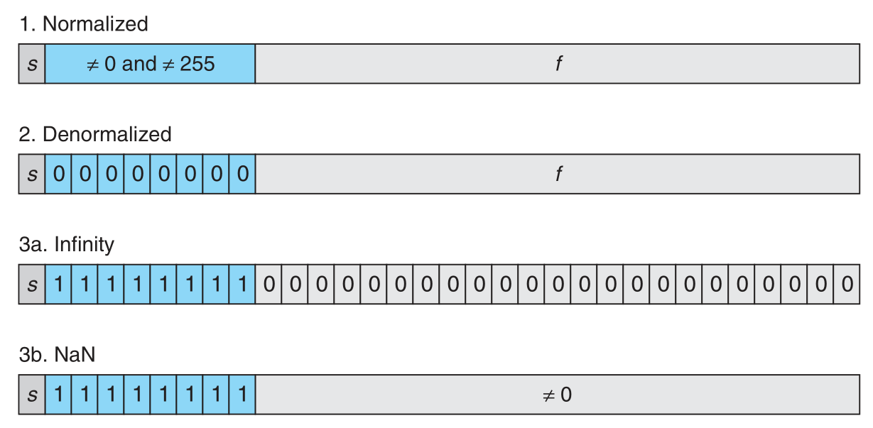 对于一个给定的浮点数位表示,对其的解释根据阶码字段的值可以分成三种情况(最后一种情况有两个变种):