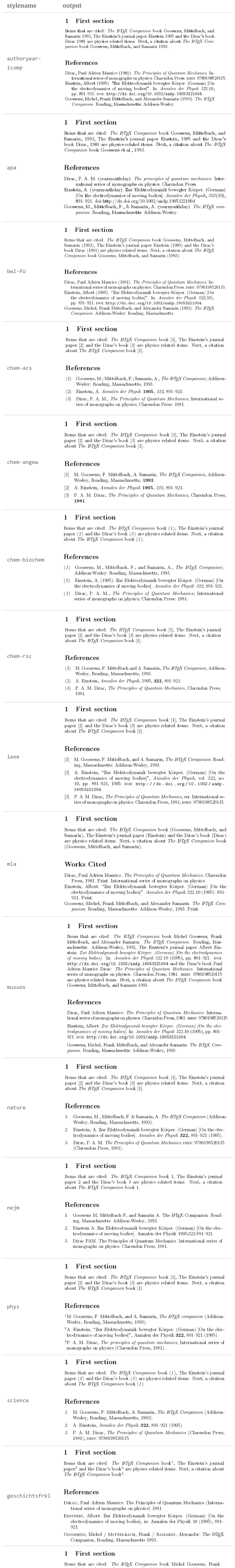 numberic: 数字样式numberic-comp: 自动聚合连续的数字:[1, 2, 3] 聚合为 [1-3]numberic-verb: 自动分解连续的数字:[1, 2, 3] 分解为 [1];[2];[3]alphabetic:alphabetic-verb: 分解连续的 citationauthoryear:authoryear-comp: 同一个作者的不同年份的引用聚合:Doe 1992, Doe 1995 聚合为 Doe 1992, 1995authoryear-ibid:authoryear-icomp:authortitle:authortitle-comp:authortitle-ibid:authortitle-icomp:authortitle-terse:authortitle-tcomp:authortitle-ticomp:verbose:reading: