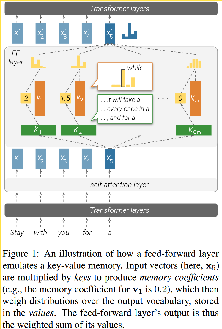 作者提出 FFN 层相当于神经记忆系统,以第一个矩阵为 key, 第二个矩阵为 value 记录了键值对信息。其中的 key 指人类可解释的文本特征(表层的文本结构特征和深层的文本语义特征), value 则可以诱导成在词典空间中的概率分布。